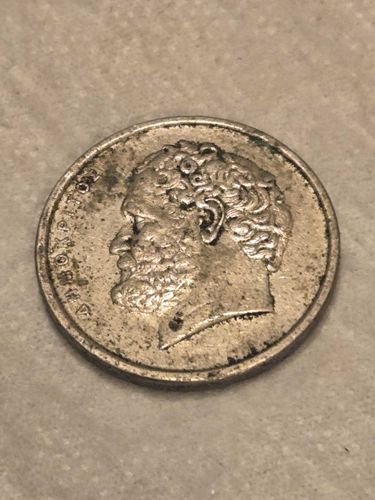 Democritus was a pre-Socratic Greek philosopher who formulated the atomic theory of the universe. This coin belongs to the Third Hellenic Republic series, which commemorated historical and cultural figures from Greece's past.