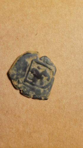 An irregularly shaped 'cob' coin made of copper. It features a prominent countermark (stamp) depicting a lion within a shield, which was used to revalue the currency.