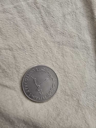 The Dirham was introduced in 1973 to replace several currencies used in the region. The Dallah coffee pot is a symbol of Emirati hospitality and tradition. This specific version is from the revised smaller-sized minting introduced in 1995.