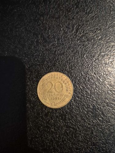 Small gold-colored coin featuring the denomination '20 CENTIMES' and year '1983' on the reverse, surrounded by an olive branch and the French national motto 'LIBERTE EGALITE FRATERNITE'.