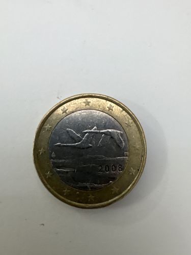 The coin shows the reverse side of a 1 Euro coin. The design features a geographical image of Europe, symbolising unity, with 12 stars (representing the original 12 founders of the EU) surrounding it. The year '2008' is clearly visible. The specific national side of this coin is not visible.