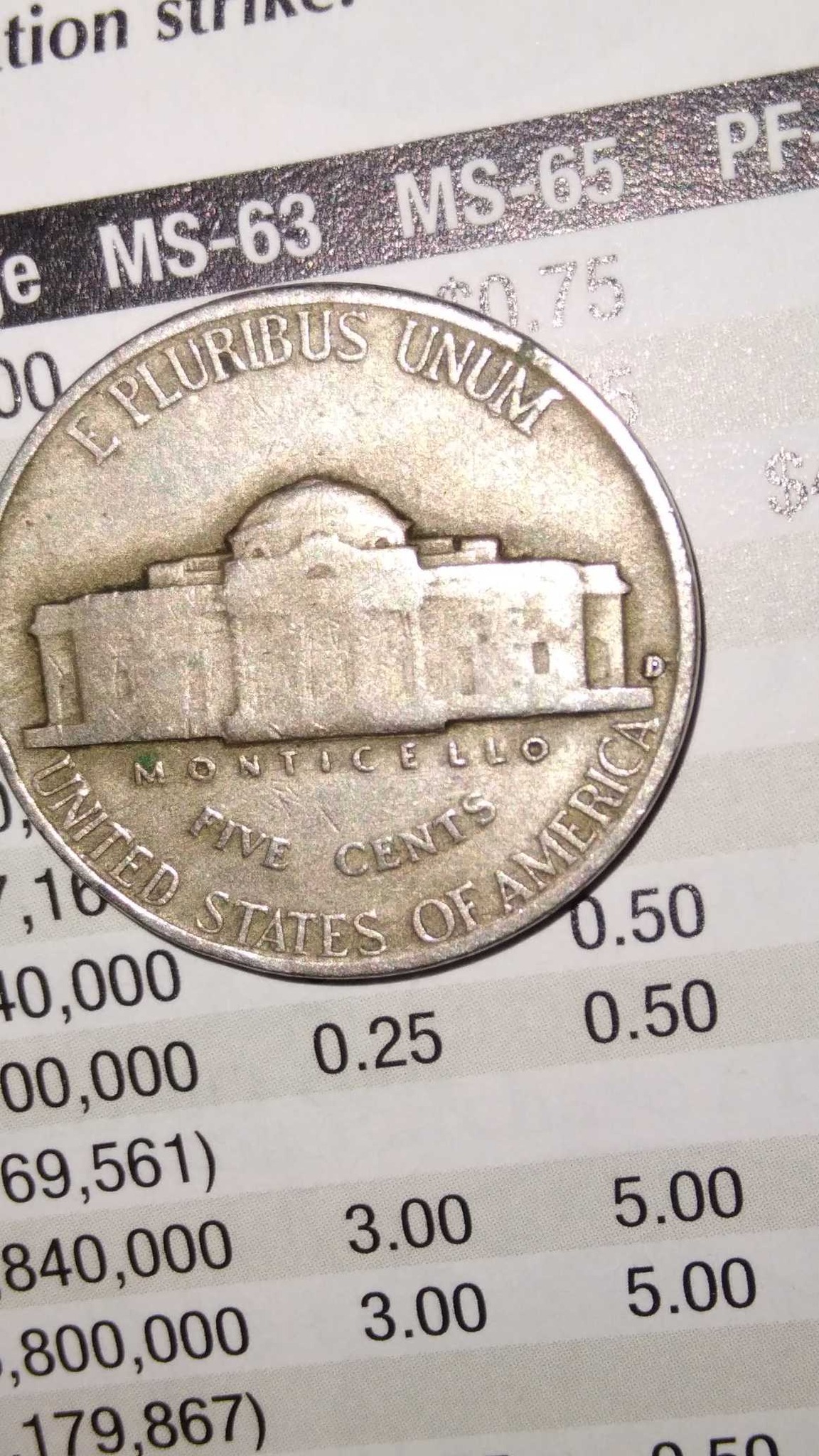1942-1945 Silver War Nickels (identified by a large mint mark above the dome of Monticello) and modern post-2006 Jefferson Nickels with the forward-facing portrait.