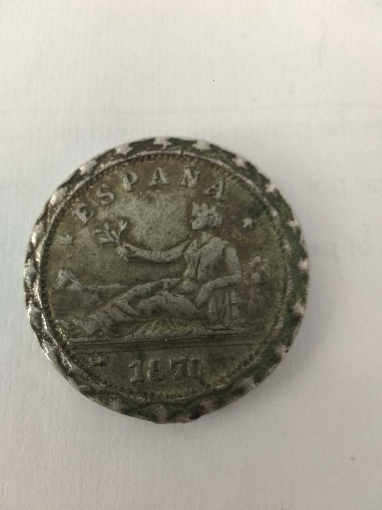 Hispania reclining against the Pyrenees mountains, holding an olive branch. 'ESPAÑA' above, date '1870' below. Two small stars on the sides contain the actual year of mintage.
