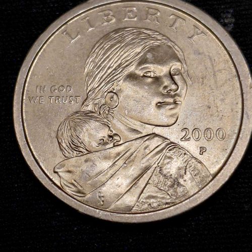 The obverse features a profile of Sacagawea carrying her infant son, Jean Baptiste Charbonneau, on her back. It includes the inscriptions 'LIBERTY', 'IN GOD WE TRUST', and the year 2000.