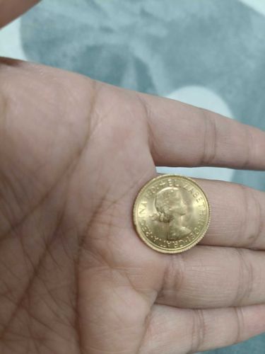 Small gold coin featuring the 'Mary Gillick' laureate bust of a young Queen Elizabeth II facing right. The inscriptions read 'ELIZABETH II DEI GRATIA REGINA F: D:'. The reverse typically features Saint George and the Dragon.