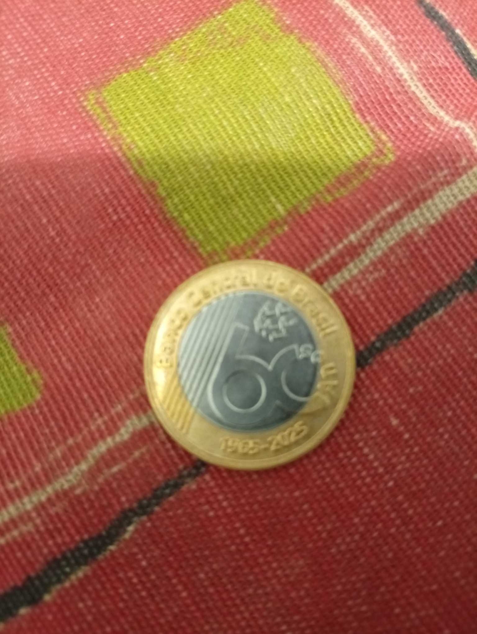 Commemorative bimetallic coin with a silver-colored center and gold-colored outer ring, featuring the 50th-anniversary logo of the Central Bank of Brazil.