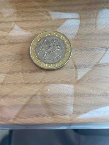 The coin features a design that represents the coat of arms and other national symbols of San Marino.