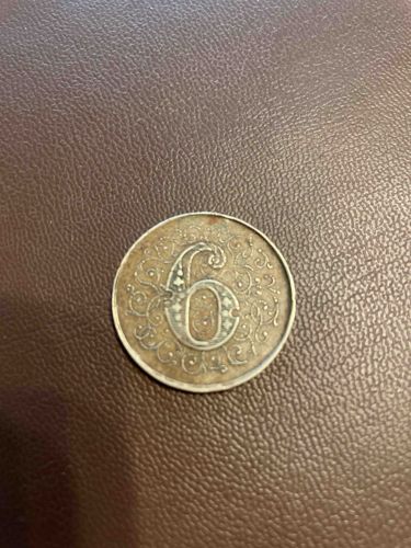 A silver coin featuring the numeral '6' prominently, with intricate decorative designs.
