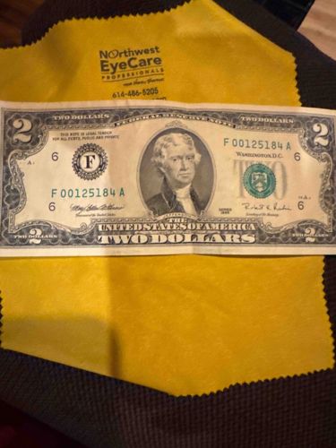 The $2 bill is a denomination of United States paper currency that features a portrait of Thomas Jefferson. The reverse side shows a depiction of the signing of the Declaration of Independence.
