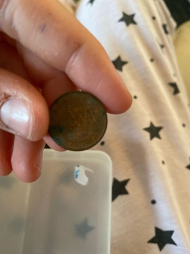 The coin appears to be an old, circulated base metal coin, likely copper or bronze, given its reddish-brown color and what seems to be some verdigris or environmental toning. The design is not discernible due to the poor image quality and wear, but some faint circular patterns or text might be present.