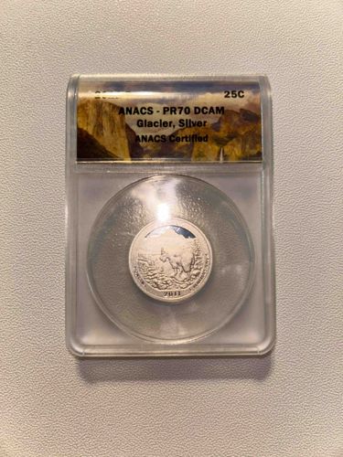 The coin is the 2011 25 cent "Glacier" America the Beautiful Silver Proof Quarter struck by the U.S. Mint. The image shows the reverse of the coin with a goat on a mountainside. The coin is encased in a protective holder with an ANACS certification label.