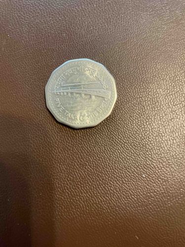 A 5 Riyals coin from Qatar featuring the national emblem. The design may include elements symbolic of Qatari heritage and culture.