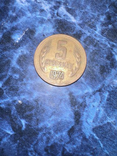 The obverse of the coin shows the denomination '5 CTOТИНКИ' (5 Stotinki) with the year '1974' below it, flanked by stylized wheat ears.