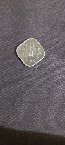 A lightweight, small, square-shaped coin with rounded corners. The obverse features the Lion Capital of Ashoka and the reverse shows the numeral '1' with 'PAISA' in English and Hindi, and the year 1966.