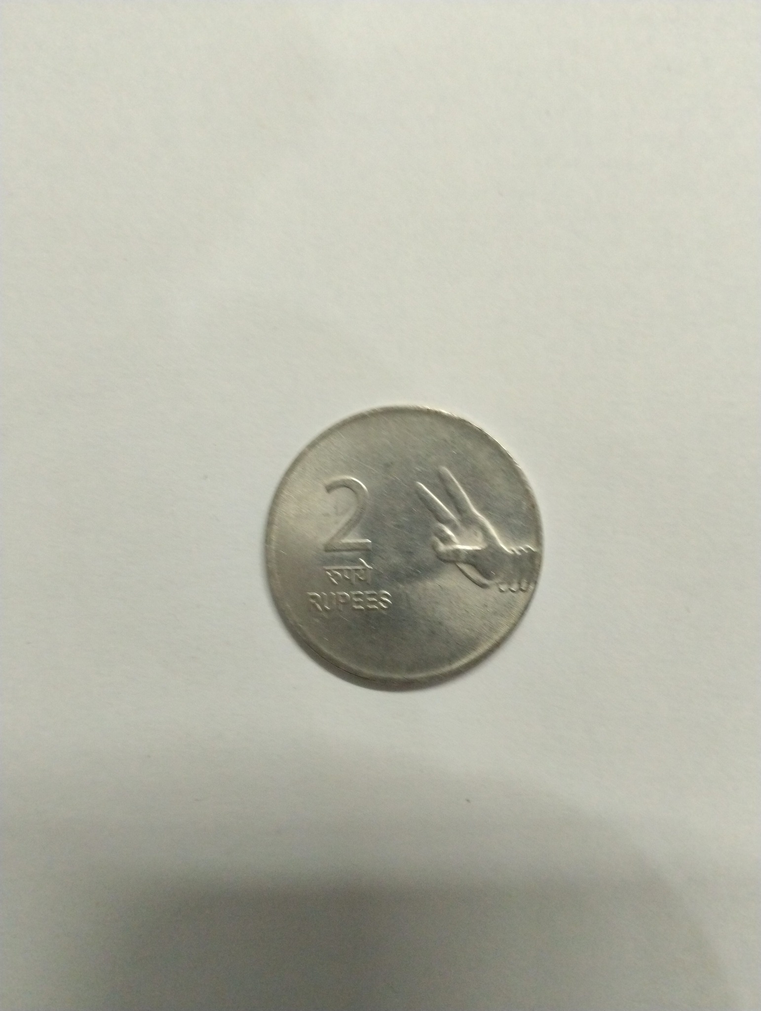 Features a hand gesture showing two fingers (index and middle fingers), representing the number 2. To the left of the hand is the numeral '2' above the word 'RUPEES' in Hindi and English.