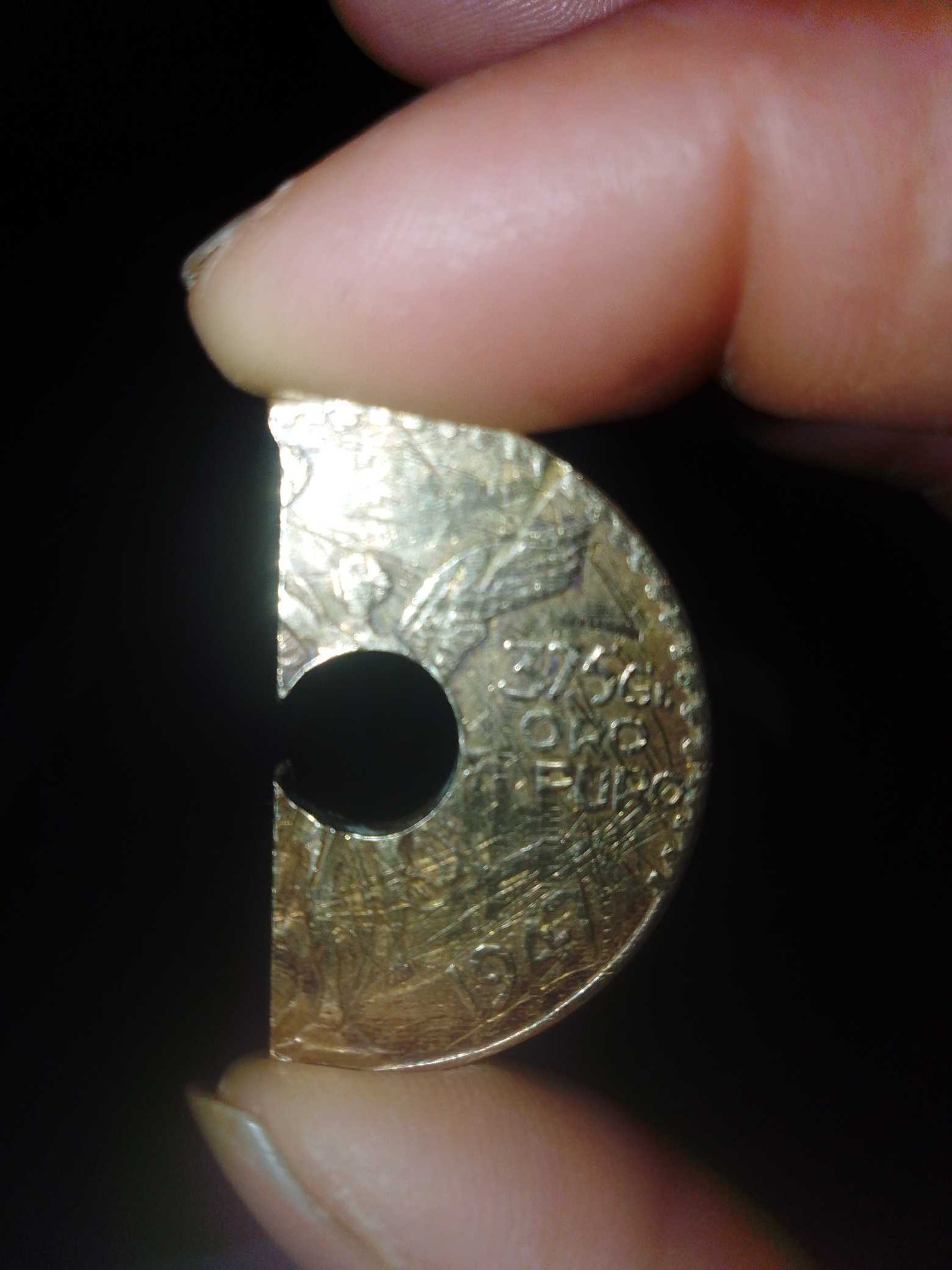 A cut and drilled piece of a gold Mexican 50 Pesos coin. Approximately half the coin remains with a large central hole.