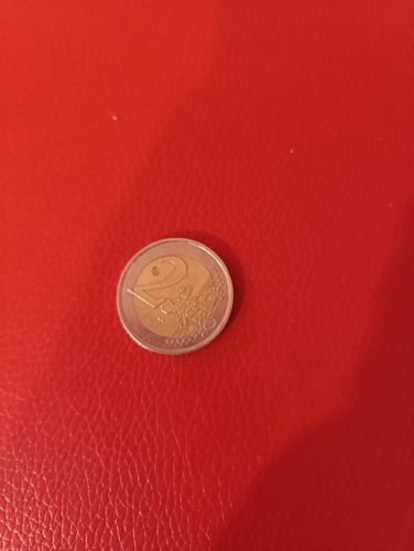A bimetallic coin with a gold-colored center and a silver-colored outer ring. The common side features the numeral 2 and a map of Europe next to six vertical lines and twelve stars.