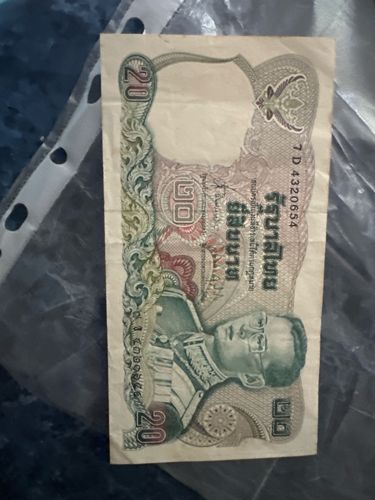 This 20 Baht banknote belongs to the 12th series of Thai banknotes. King Bhumibol Adulyadej, who reigned for 70 years, is the central figure on virtually all Thai banknotes issued during his reign. Notes featuring him reflect a period of significant development and stability in Thailand. The specific series and year of issue can indicate various economic or political contexts of that time in Thailand.
