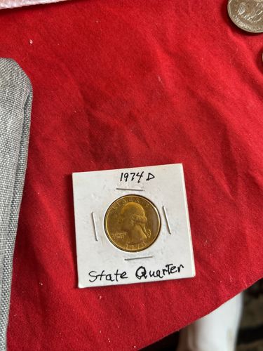 A standard 1974-D Washington Quarter in uncirculated condition (MS-60 to MS-65) typically ranges from $0.50 to $5.00. If the golden tone is due to an error, such as being struck on a brass planchet (highly unlikely for a circulating quarter but possible for an experimental piece), or being part of a special mint set with different metallic composition characteristics (which is unlikely for a 1974 circulation strike), its value could be significantly higher. However, based on the image, it most likely is a standard copper-nickel clad quarter that has toned golden over time, or perhaps a special uncirculated finish. Without clearer images or physical inspection, assuming it's a regular uncirculated 1974-D Quarter, its value would be in the lower range. The "State Quarter" label is incorrect as State Quarters began in 1999.