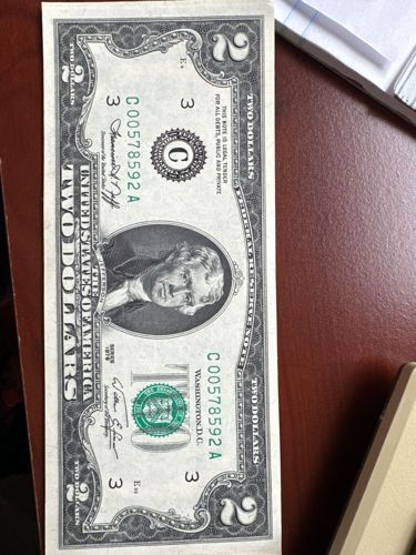 A United States banknote featuring a portrait of Thomas Jefferson on the obverse and an engraving of 'The Declaration of Independence' by John Trumbull on the reverse.