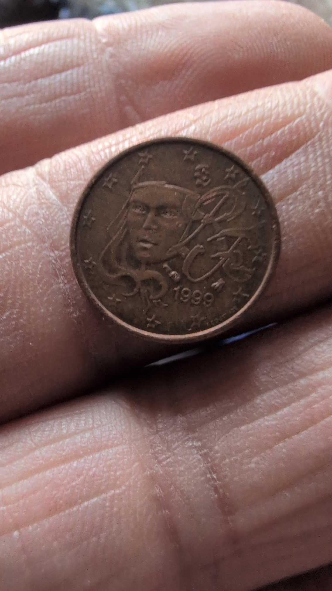A portrait of Marianne, the national symbol of the French Republic, wearing a Phrygian cap. Designer: Fabienne Courtiade. Surrounded by 12 stars of the EU and the year 1999.