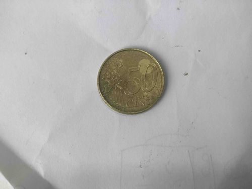 The 50-cent coin features a common design depicting a map of Europe and various plant motifs, representing the unity of European nations. It is part of the Euro currency system introduced in 2002.