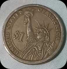 The reverse of the coin features an image of the Statue of Liberty, the inscription 'UNITED STATES OF AMERICA', and the denomination '$1'. It has a distinctive golden color.