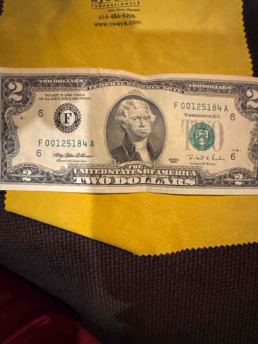 The $2 bill features a portrait of Thomas Jefferson on the front and a depiction of the signing of the Declaration of Independence on the back.