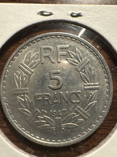 The reverse features the denomination '5 FRANCS' and 'RF' (République Française) surrounded by a circular laurel wreath. The year 1947 is at the bottom. The obverse (not pictured) typically features the profile of a woman representing Liberty wearing a laurel wreath.
