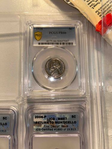 The 1938 Jefferson Nickel features a profile of Thomas Jefferson on the obverse (front) and a depiction of his home, Monticello, on the reverse (back). This particular coin is graded PCGS PR66 (Proof 66).