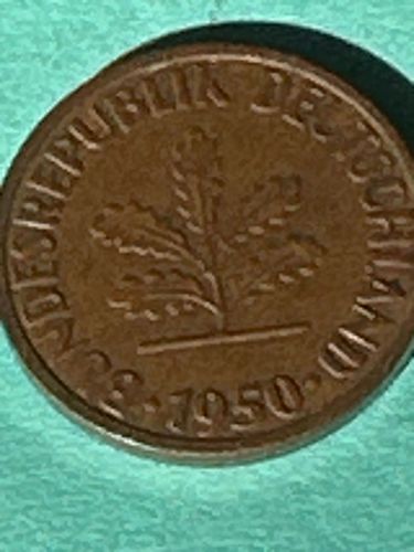 The obverse features an oak seedling, symbolizing growth and rebirth, with the legend 'BUNDESREPUBLIK DEUTSCHLAND' and the year '1950' at the bottom. The reverse (not shown) depicts the numeral '1' between two ears of rye.