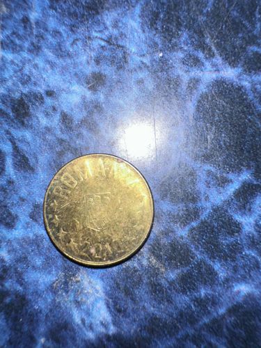 The coin features 'ROMANIA' at the top, the national coat of arms of Romania in the center, and below it the year of issue, which appears to be 2005. The overall appearance is golden.