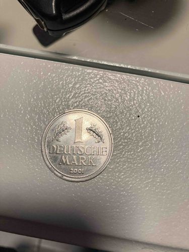 The 1 Deutsche Mark coin features the denomination '1' and the inscription 'DEUTSCHE MARK' along with the year of issue. The design is framed by two olive branches, symbolizing peace.