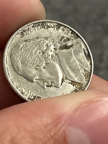 Given the heavily worn condition and visible corrosion/damage, the estimated value for a 1936 Buffalo Nickel would be at the lower end, likely between "$0.25" and "$1.00" for its metal content and as a damaged circulated coin. If there were no damage, a heavily circulated 1936 nickel might fetch a few dollars, but this specific coin's condition is poor.