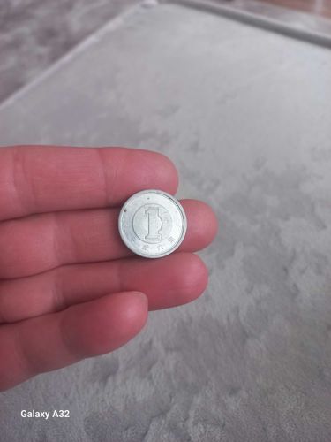 A small, lightweight silver-colored coin. The obverse features a large numeral '1' signifying the denomination, surrounded by the country's name and year of minting in Kanji. The reverse (not shown in photo) features a young sapling tree.
