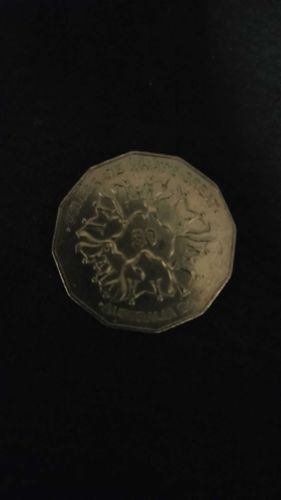 A dodecagonal (12-sided) coin. The reverse features a stylized logo for the Year of the Outback, which shows a ring of several animals (kangaroos, emus, etc) encircling the number 50. The obverse features the portrait of Queen Elizabeth II.