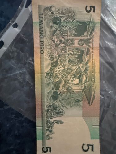 The estimated value of a 5-Piso banknote from this era is generally low, ranging from a few cents to a few dollars (USD) for circulated notes, depending on their condition. Uncirculated or very well-preserved notes with specific dates or serial numbers might fetch slightly more among collectors, but are still not considered rare or highly valuable. This specific note appears to be circulated and stored in a plastic sleeve, which might preserve it but doesn't necessarily add significant value.