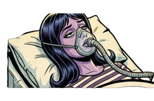 An illustration of a woman with dark hair lying on a pillow, wearing an oxygen mask. The style is reminiscent of mid-20th-century pop art or comic books.
