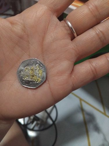 A heptagonal coin featuring a detailed depiction of the Palace of Westminster with gold and black color highlighting.