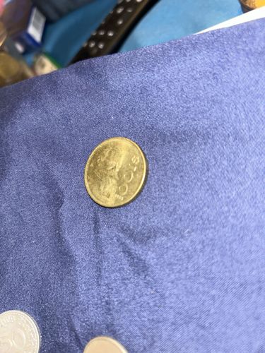 The coin appears to be a brass-colored round coin. On the visible side, there is a depiction of a person's head facing left, and text (Bicentenario) is visible along the right edge of the coin.