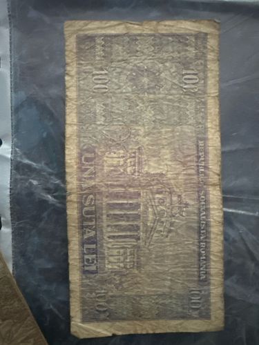 The image shows the reverse side of a 100 Lei Romanian banknote. The text "O SUTA LEI" (One Hundred Lei) is clearly visible horizontally on the left side, and the denomination "100" appears multiple times. The top right corner includes the text "REPUBLICA SOCIALISTA ROMANIA" (Socialist Republic of Romania). The central design appears to be an architectural building, possibly the Palace of the Parliament (formerly People's House) or another significant government building.