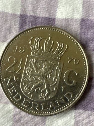 The reverse features the crowned coat of arms of the Netherlands, centered with the date 1970 and the denomination 2 1/2 G at the sides. 'NEDERLAND' is inscribed at the bottom. The obverse depicts Queen Juliana facing right.