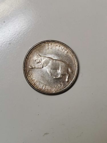 The reverse side features a prowling bobcat designed by Alex Colville, with the inscriptions '25 CENTS' above and 'CANADA 1867-1967' below. The obverse features the portrait of Queen Elizabeth II.
