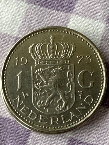 The obverse features the crowned coat of arms of the Netherlands, a lion with a sword and a bundle of arrows surrounded by the text '1 G' and 'NEDERLAND'. The year 1973 is split on either side of the crown.