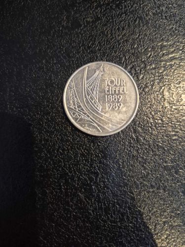 The reverse features a stylized bird's-eye view of the Eiffel Tower with the inscription 'TOUR EIFFEL 1889 1989'. The obverse features the word 'République Française' with the value and year.