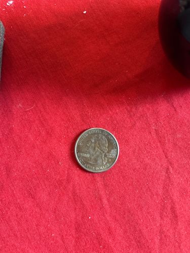 The coin clearly shows the obverse side of a U.S. quarter, featuring the portrait of George Washington facing left. The inscriptions 'UNITED STATES OF AMERICA', 'LIBERTY', 'IN GOD WE TRUST', and 'QUARTER DOLLAR' are visible, along with the year '2007'. The coin appears to be circulated with some wear and discoloration.