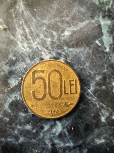 The coin shows the denomination '50 LEI' prominently on the obverse, with the year '1993' below it. There are also some ornamental elements, possibly wheat ears or oak branches, on either side of the year.