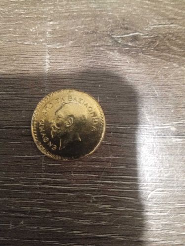 A gold-colored coin featuring the left-facing profile of King George I of Greece. The Greek inscription reads "ΕΝΘΥΜΙΟ ΑΠΟ ΤΗ ΒΑΣΙΛΕΙΑ" which translates to "Souvenir from the Reign".