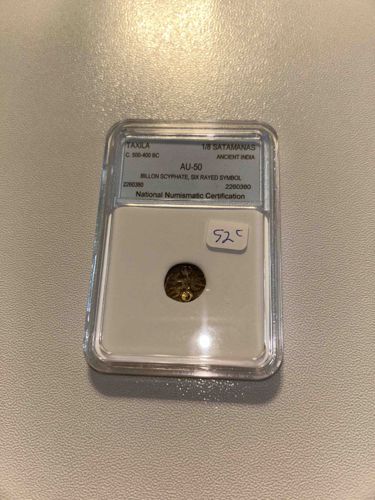 Based on online research of similar Taxila coins, the estimated value for a coin in AU-50 condition could range from $150 to $400 USD, but note there is a handwritten '525' on the case which likely indicates the purchase price.