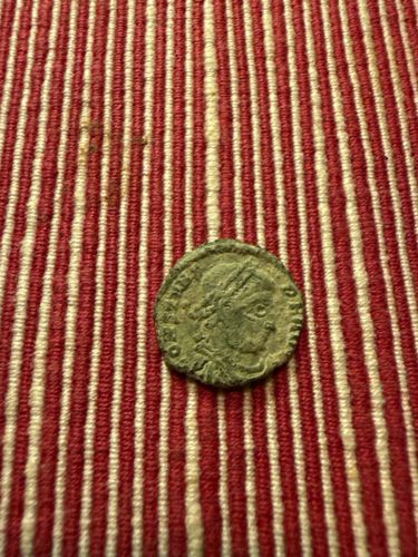 A small, weathered bronze coin. The obverse features a profile bust of a Roman emperor (reminiscent of the sons of Constantine, likely Constantius II) wearing a diadem. The reverse typically features military or allegorical themes, though not visible here.